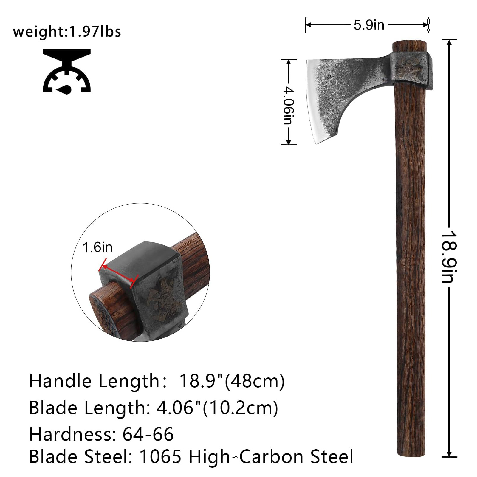 - 【Sturdy and Durable】: Our axe is forged from 1065 high carbon steel, and the handle is made of beech wood, ensuring lasting durability. With a total length of 19 inches and a handle length of 17.5 inches, the head weighs 1.6 pounds, resulting in a total weight of 2.35 pounds.